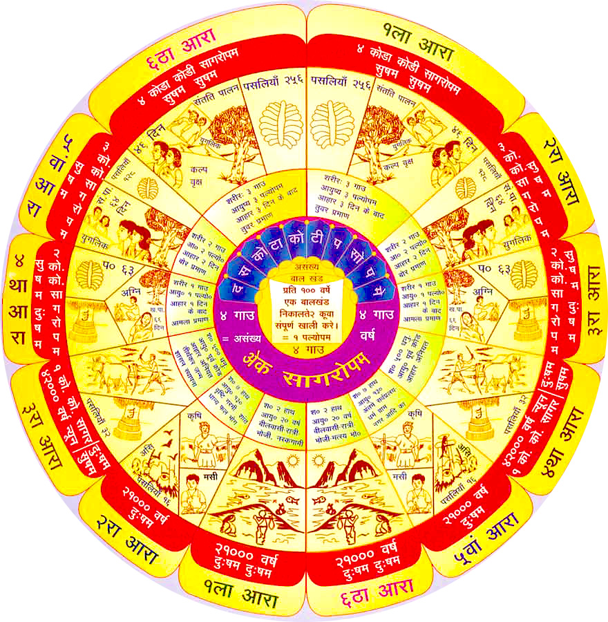 But as the present day world understands it 'Jainism has started with the advent of "Bhagwan Rishabh Dev" -The first Tirthankara of Jains'. He was the first Tirthankar of Jains who lived a life of 84 lac years before getting "Nirvan"(independence from birth & re-birth). To understand the exact time period of "Lord Rishabh Dev", it is very important for all of us to understand our "Kal Chakra". (figure) All lives on Earth are governed by this "Chakra". Many "Kal Chkra" have passed away before the present and the 5th "Kal Chakra". The One we are living in.