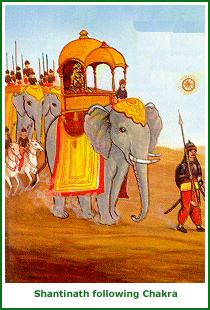 The account of the earlier incarnations of Bhagwan Shantinath indicates that this soul had taken the path that lead towards purity of soul. As a result of his upliftment of the soul as Shrisen and Vajrayudh he got birth as Meghrath, son of King Dhanrath of Pundarikini town in Mahavideh area. King Dhanrath gave his throne to his son and became ascetic.