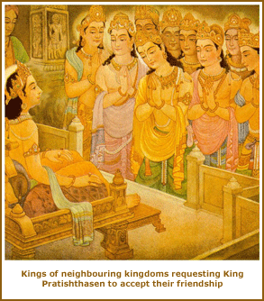 From the dimension of gods this soul descended into the womb of queen Prithvi Devi, wife of king Pratishthasen of Varanasi. One fine morning King was sitting with other honored members of the kingdom. They were serious as all four sides of the kingdom were endangered by the neighboring kingdoms who were ready to attack.